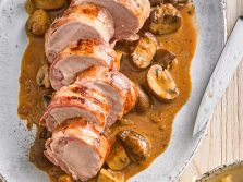 File de porc învelit în slănină cu ciuperci și spaetzle